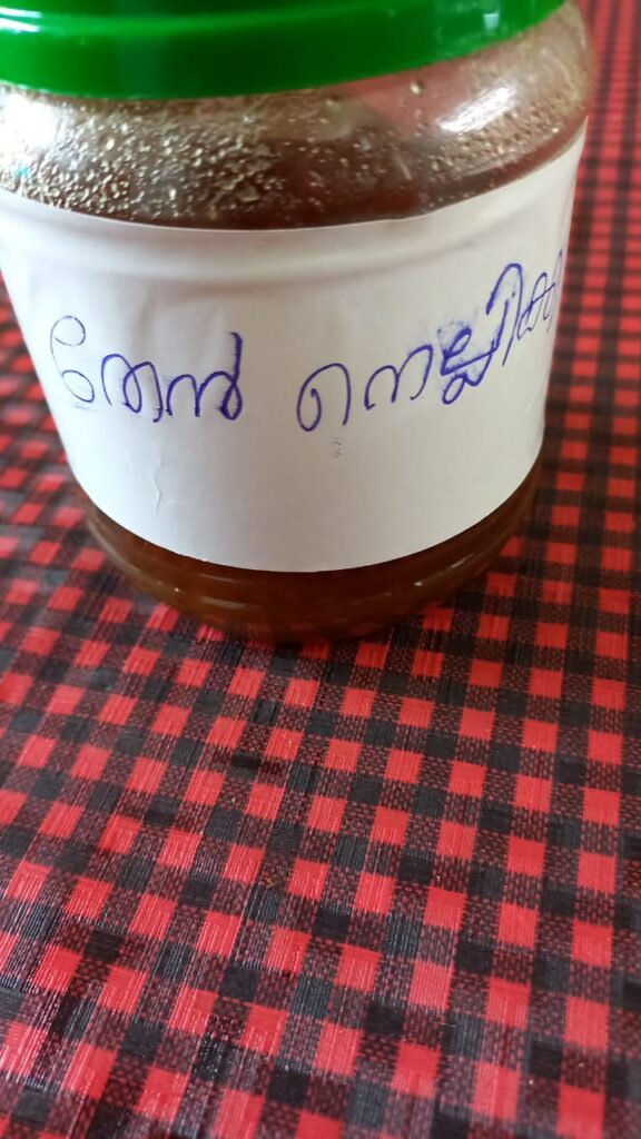 തേൻ നെല്ലിക്ക – നെല്ലിക്കയിൽ പച്ച ഊർക്കിൽ ഉപയോഗിച്ച് ദ്വാരമുണ്ടാക്കി ശുദ്ധമായ തേനിൽ 21 ദിവസം ഭരണിയിൽ കെട്ടിവെച്ചത്.350 ഗ്രാം 140 രൂപ.