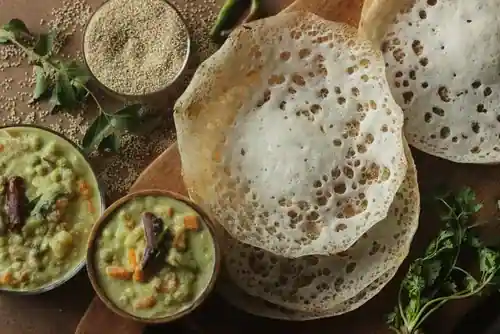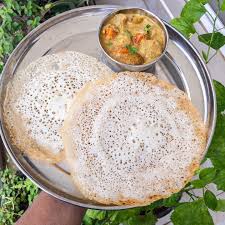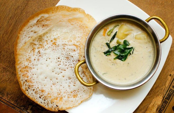 Enjoy the perfect combination of soft and fluffy appams paired with rich and aromatic vegetable kuruma, made with fresh veggies and a blend of traditional spices for a delightful meal.