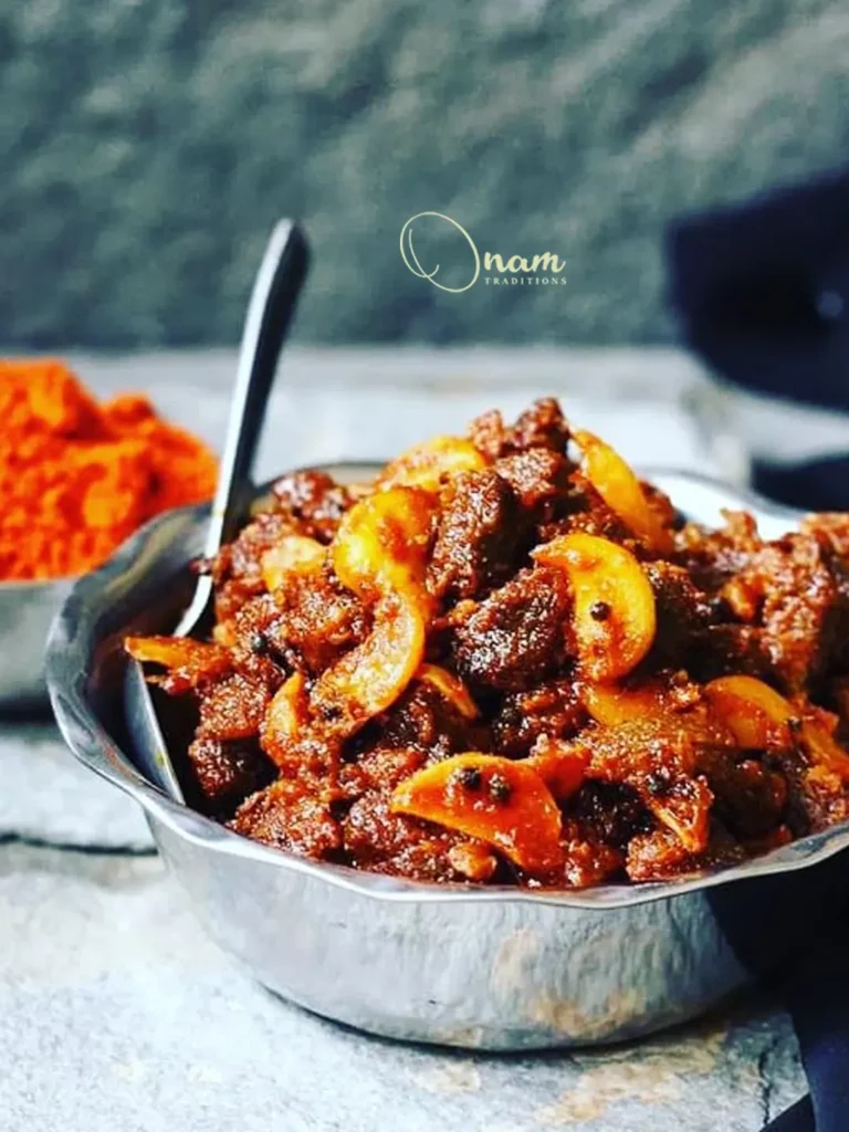 Homemade beef pickle is a rich and flavorful traditional delicacy, especially popular in Kerala cuisine. It is prepared using tender beef pieces that are thoroughly cleaned, pressure-cooked with salt and spices until soft, and then shallow-fried to enhance texture and taste. This step helps seal in the flavors and improves the shelf life of the pickle.
