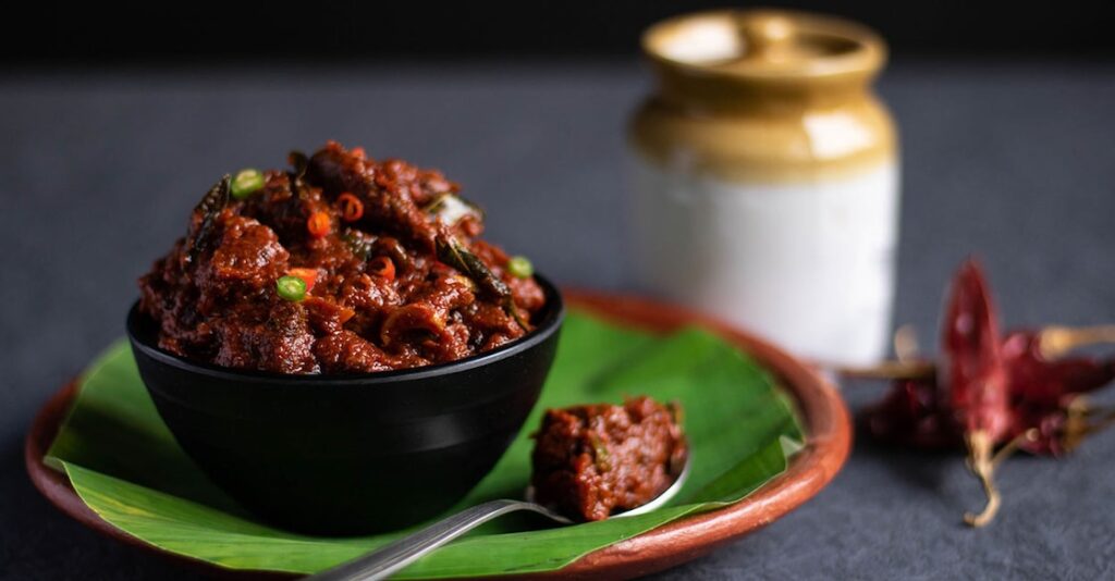 Succulent beef is pressure-cooked until soft, then stir-fried with crushed ginger, garlic, curry leaves, and roasted spice powders. A splash of vinegar adds a sharp tang, while generous oil ensures long shelf life and intense flavor. Over time, the beef absorbs the spices, making the pickle even tastier with age.