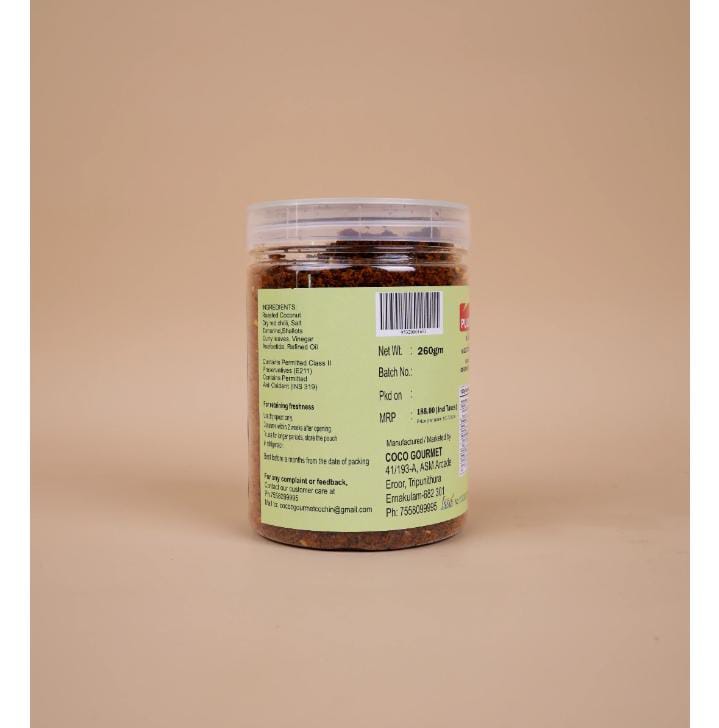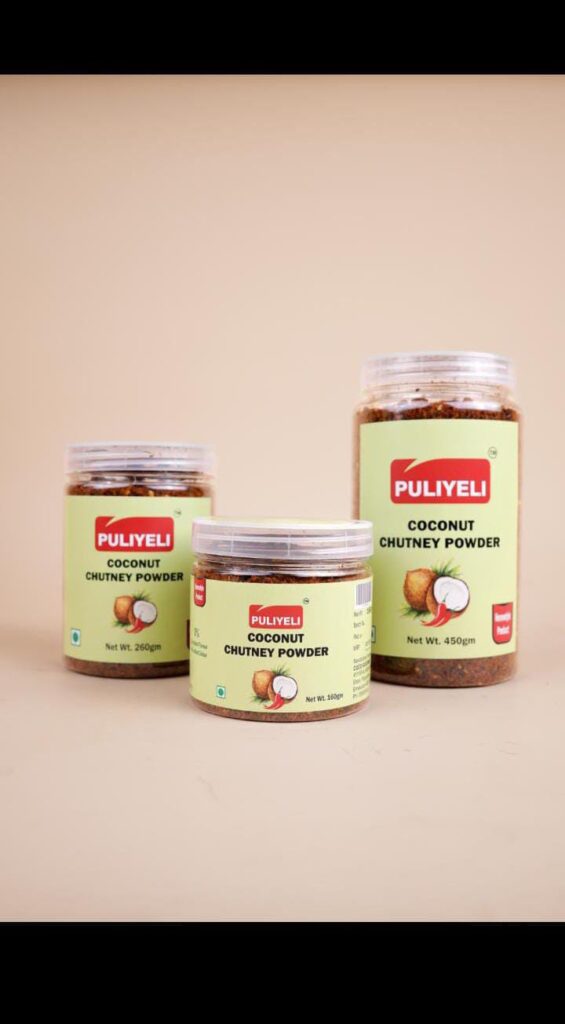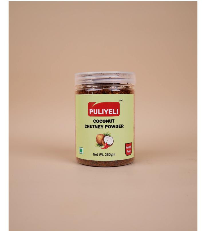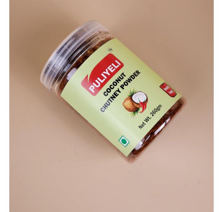 Puliyeli’s Coconut Chutney Powder is a fragrant, flavorful blend of roasted coconut, curry leaves, and spices like red chilies and mustard seeds. The coconut is roasted over a wood fire, giving the powder a rich, toasty aroma that complements the bold spices.