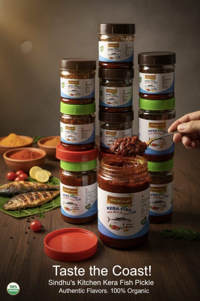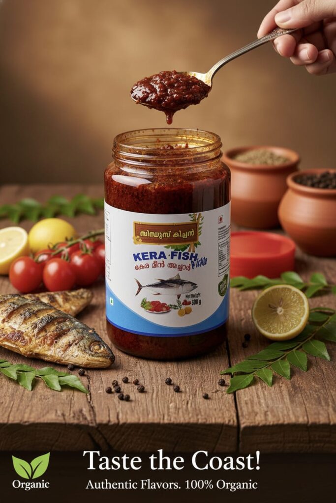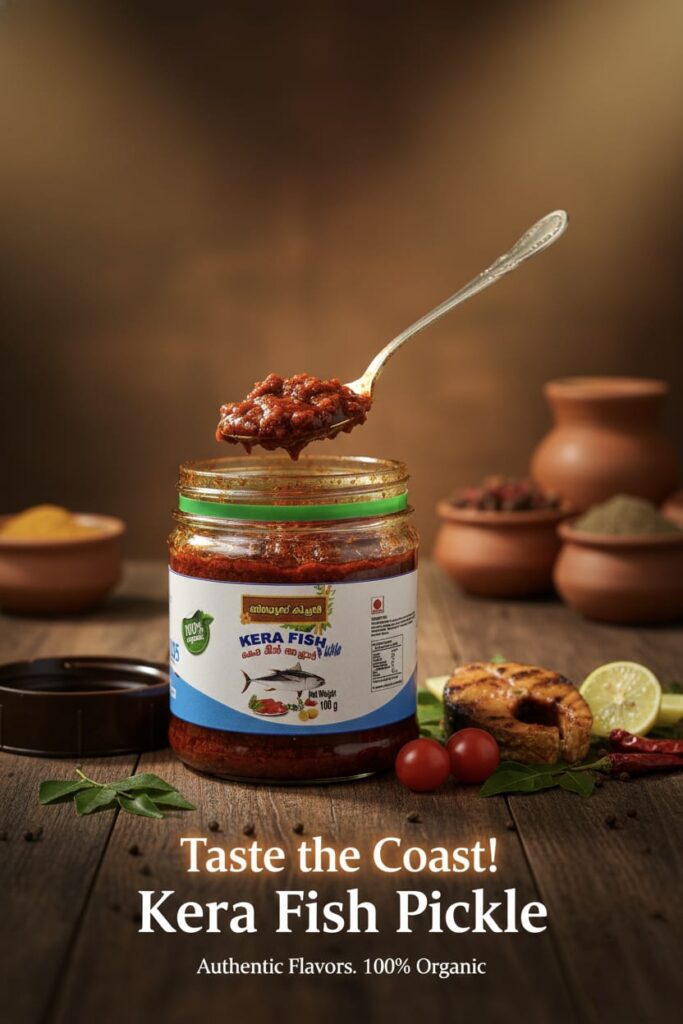 Our Kerala Fish Pickle is prepared with premium Kera (tuna) pieces slow-fried in gingelly oil and blended with authentic Kerala spices, curry leaves, ginger and garlic. A perfect mix of heat, tang and aroma—bringing home the true taste of traditional Kerala kitchens.