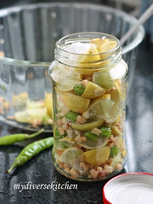 Homemade lemon chilli pickle is a flavorful traditional condiment made from fresh lemons and tender green chillies, blended with aromatic Indian spices. The lemons are cleaned and cut into pieces, while the chillies are slit or chopped, then mixed with salt, red chilli powder, turmeric, mustard seeds, fenugreek, and a touch of asafoetida. The mixture is slowly matured to allow the flavors to blend naturally.