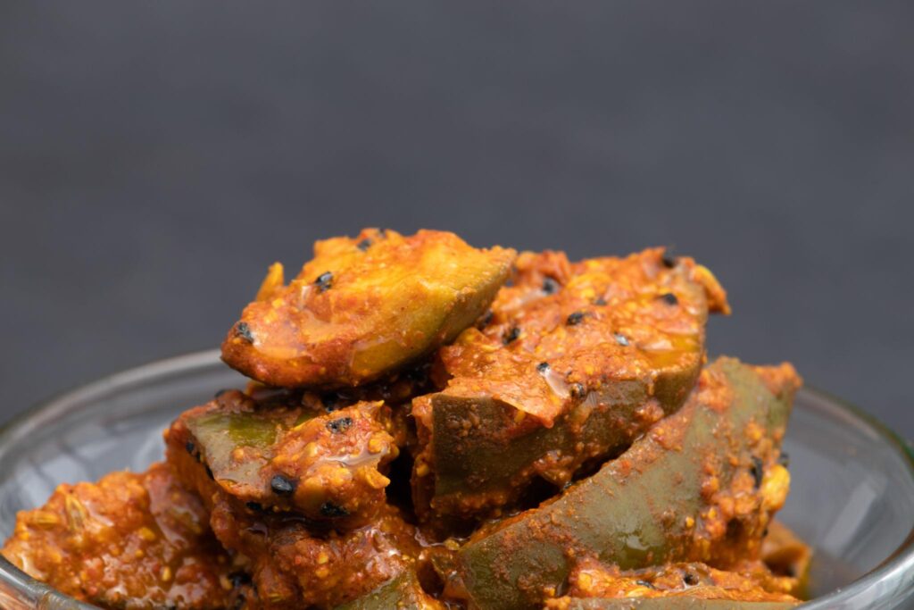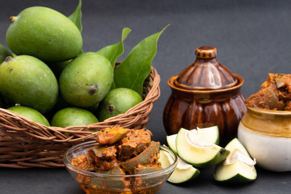 Prepared with chopped raw mangoes and juicy lemon pieces, it is blended with aromatic spices like mustard seeds, fenugreek, red chili powder, turmeric, and asafoetida. The addition of gingelly (sesame) oil enhances its rich flavor and helps preserve it for long periods.