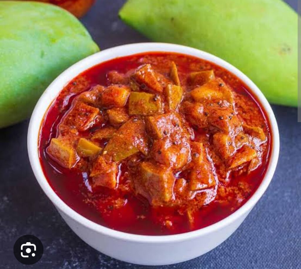 Fresh raw mangoes are washed, cut into pieces, and mixed with spices such as chilli powder, mustard seeds, fenugreek, turmeric, asafoetida (hing), and salt. The mixture is preserved using sesame oil or mustard oil, which enhances flavor and increases shelf life. Over time, the mango pieces absorb the spices and oil, developing a rich and intense taste.