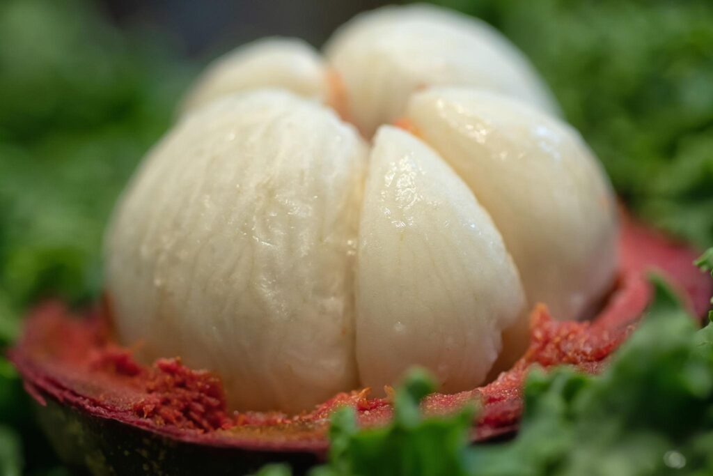 Mangosteen has a sweet and slightly tangy flavor, often described as a mix of peach, pineapple, and citrus. It is refreshing, aromatic, and melts in the mouth.