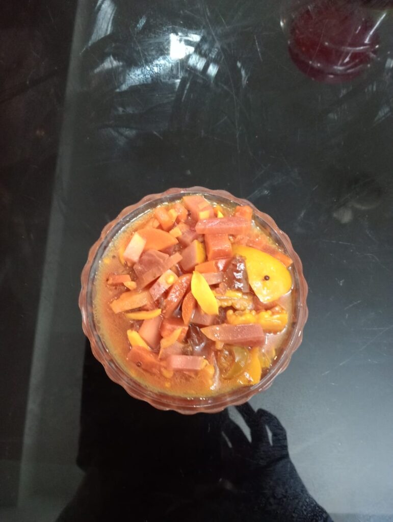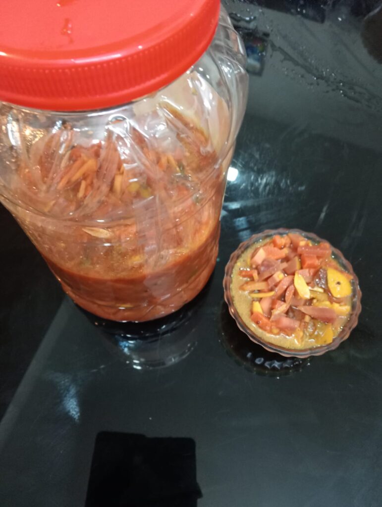 Homemade mixed vegetable pickle is a colorful and flavorful traditional condiment prepared using a variety of fresh vegetables such as carrot, cauliflower, raw mango, lemon, green chillies, ginger, and sometimes turnip or cucumber. The vegetables are thoroughly cleaned, cut into uniform pieces, lightly salted, and sun-dried or air-dried to remove moisture and enhance shelf life.