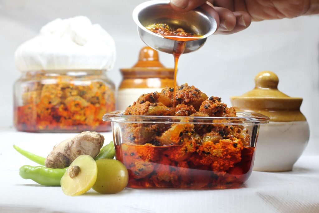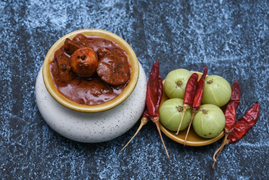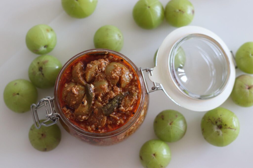 It is prepared by cooking gooseberries in oil along with spices like mustard seeds, curry leaves, red chilli powder, turmeric, fenugreek, and asafoetida. The mixture is slowly cooked until the gooseberries soften, shrink slightly, and absorb all the masala. Unlike regular pickles, this one is less watery and more concentrated.