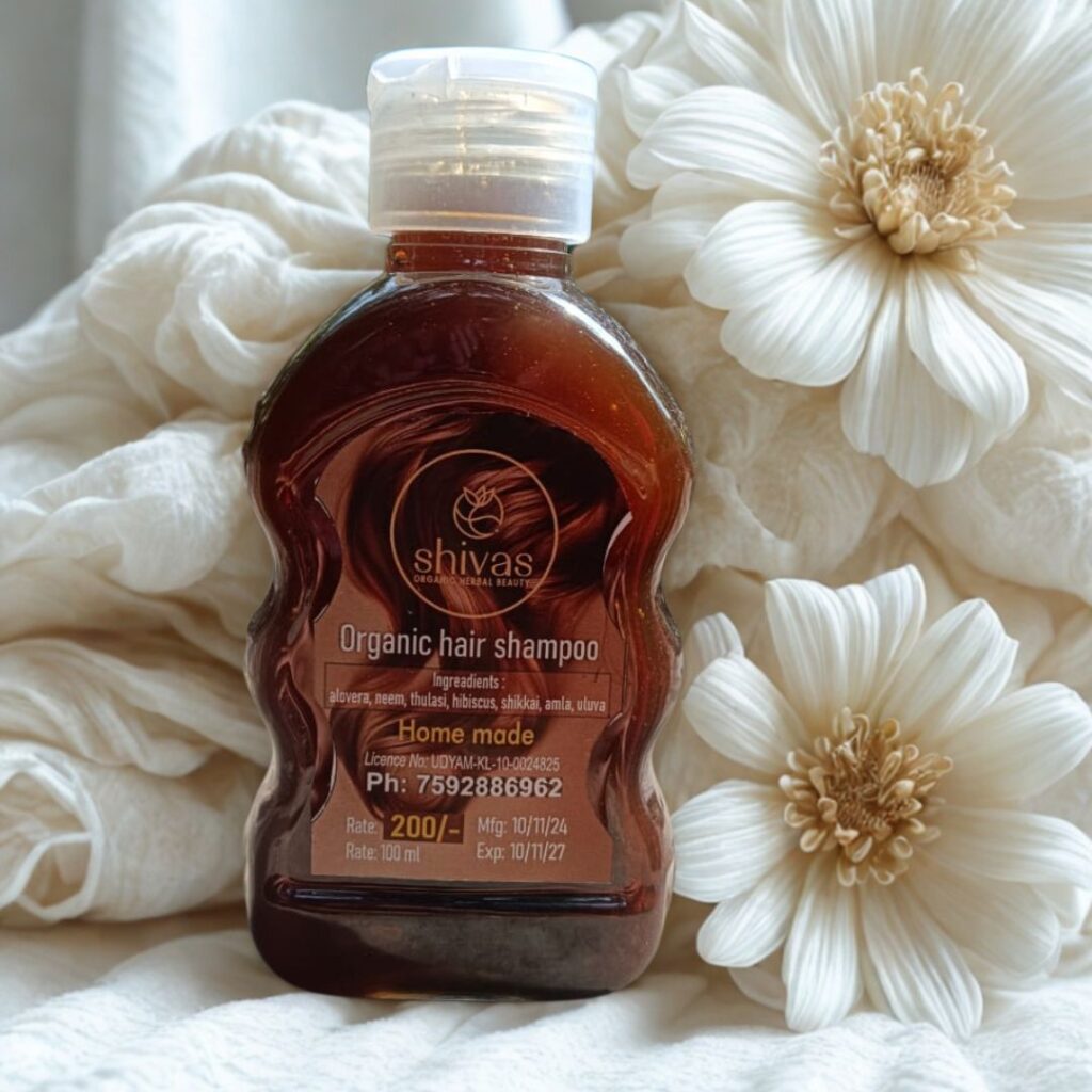 Our Homemade Herbal Hair Shampoo is a chemical-free, sulfate-free formula made from natural ingredients like shikakai, reetha (soapnut), aloe vera, bhringraj, and hibiscus. It gently cleanses your scalp while nourishing your hair, leaving it soft, strong, and naturally shiny.