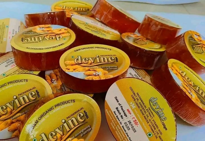 A fresh, herbal soap infused with pachamanjal (green cardamom / Elettaria cardamomum) and natural oils, giving a clean, uplifting aroma.