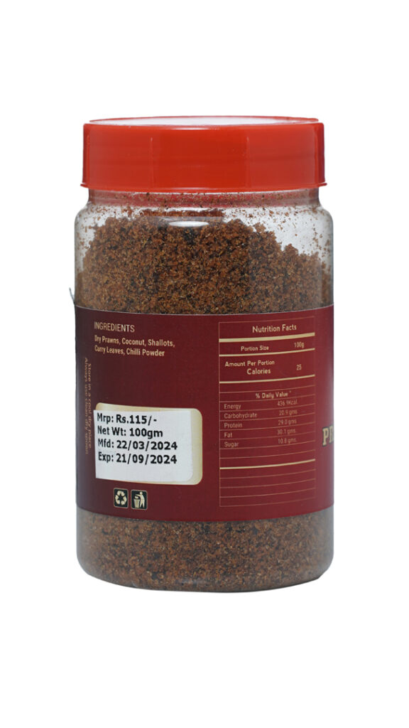 Description: Ready-to-use homemade Dry Prawns Chutney Powder made from hand-picked dried prawns. Traditional Kerala recipe, hygienically prepared.