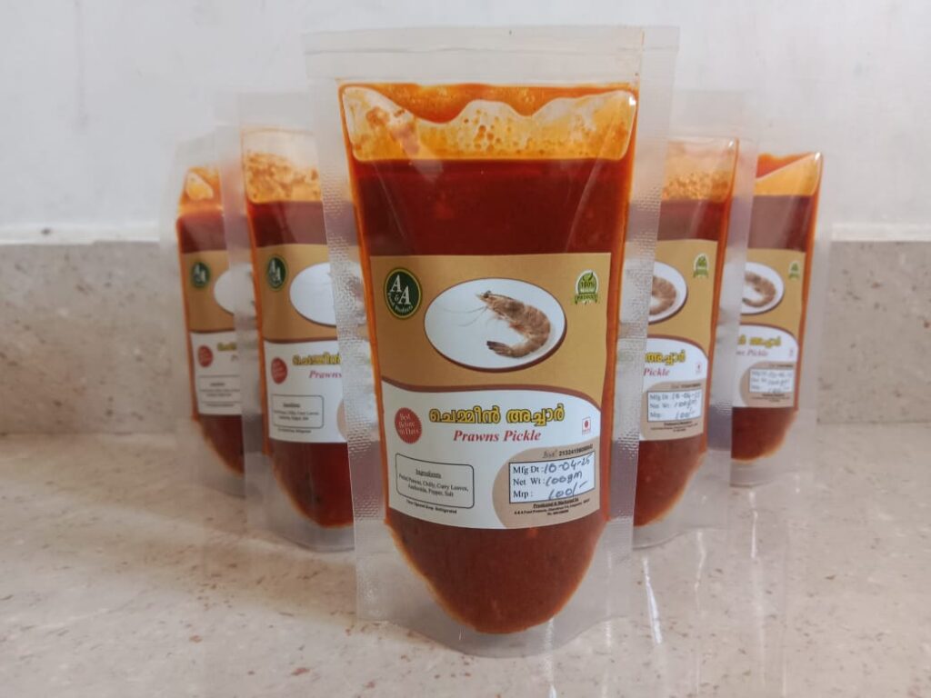 Treat your taste buds to the bold and tangy flavors of our Prawns Pickle, made with fresh prawns, slow-cooked in aromatic spices, and preserved in pure gingelly oil. A true delicacy for seafood lovers, bursting with traditional Kerala flavor.