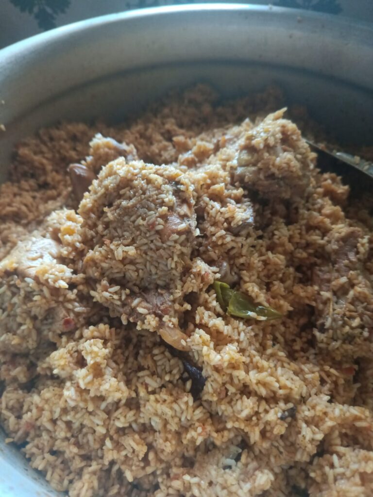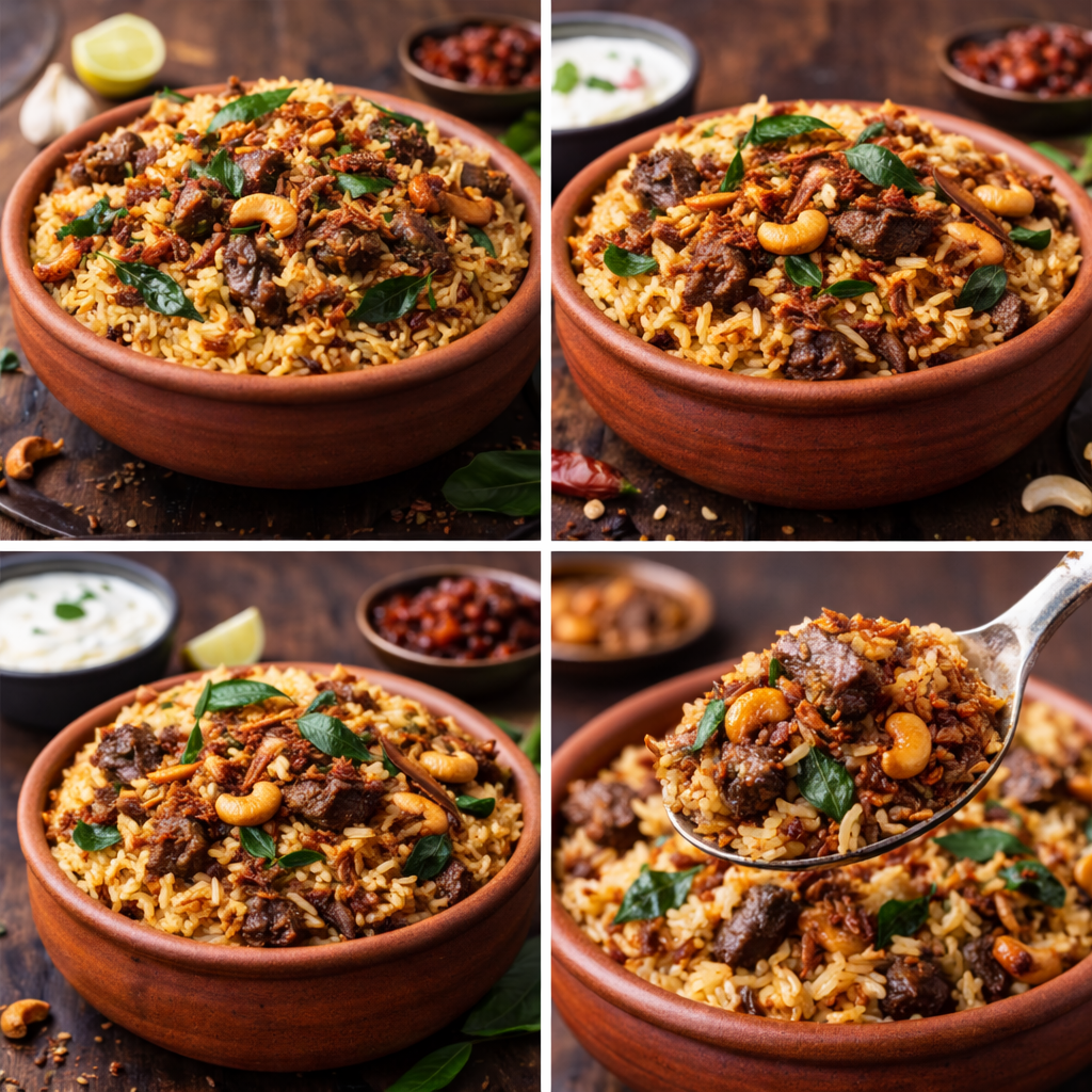 Unlike regular biriyani, Ravoothar Biriyani is known for its dark, richly spiced masala and strong aroma. The rice and meat are layered and gently dum-cooked, allowing the flavors to blend perfectly. Fried onions, ghee, curry leaves, and sometimes cashews and raisins are used for garnishing, enhancing both taste and aroma.