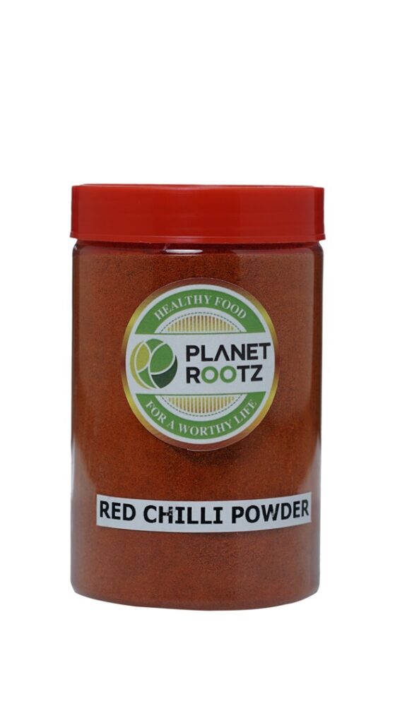 Description: Planet Rootz offers pure and premium quality homemade Red Chili Powder. It is made without synthetic colours, preservatives, or chemicals. Ground from the finest dried red chillies sourced from eco-farmers, it has a strong aroma and natural spiciness that enhances every dish.