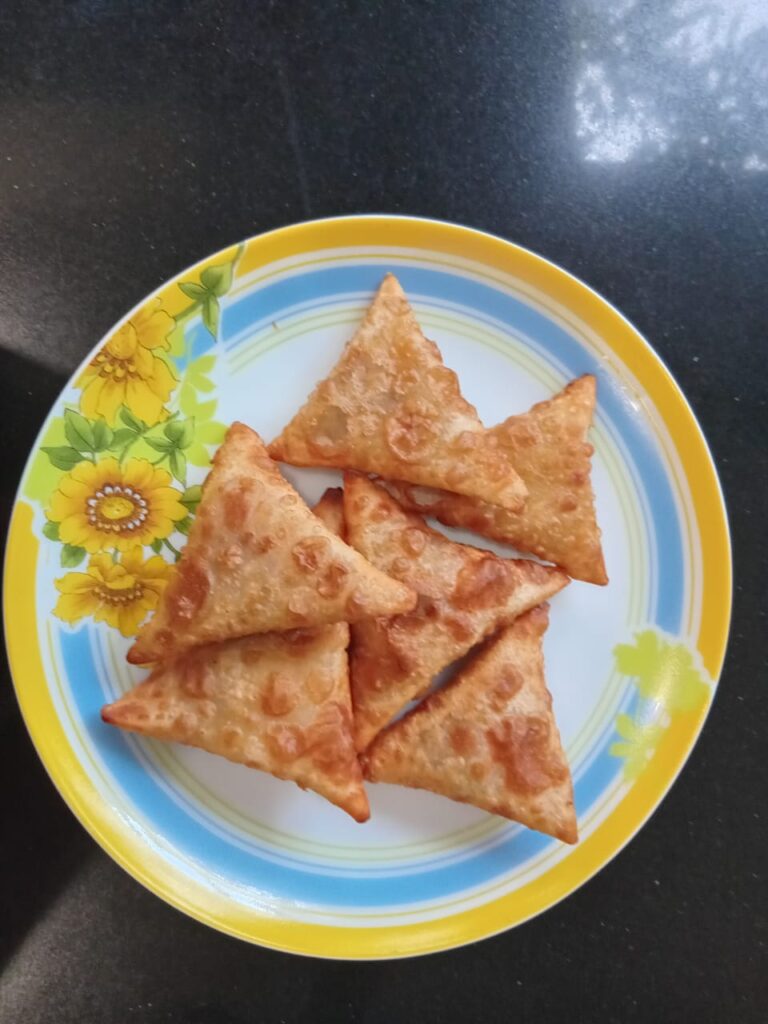 1 piece =12rs Samoosa is a popular deep-fried snack known for its crisp, golden-brown exterior and spicy, flavorful filling. The thin pastry is typically stuffed with a mixture of mashed potatoes, peas, onions, and aromatic spices, though variations can include minced meat, chicken, or lentils.