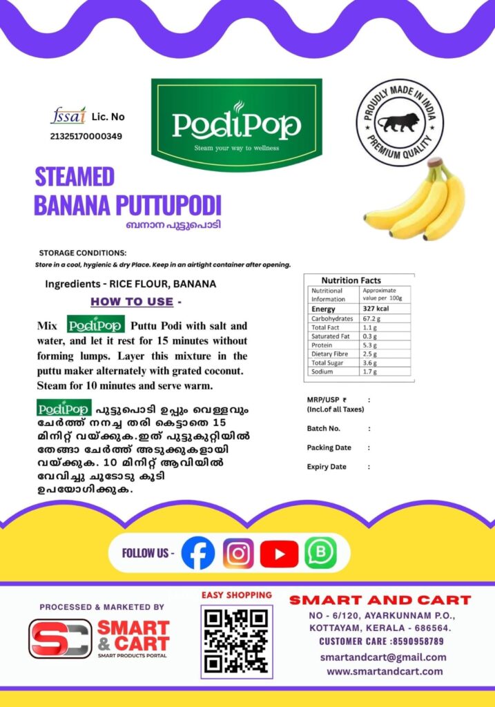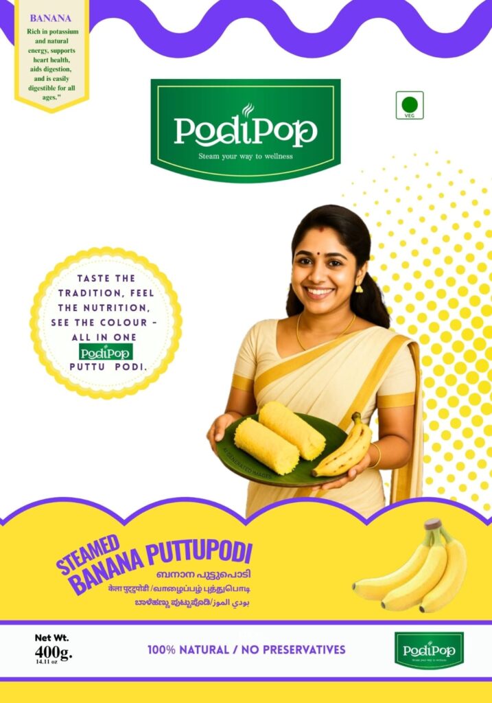 Relish the natural sweetness and nutrition of ripe bananas with our Steamed Banana Puttu Podi. Made from high-quality rice flour blended with fresh banana, it’s soft, aromatic, and rich in energy — perfect for a wholesome breakfast or snack.
