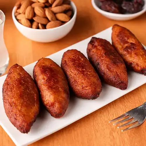 Enjoy the authentic taste of Unnakkaya, a delicious Malabar special made with ripe bananas, coconut, nuts, and jaggery, deep-fried to golden perfection. A perfect tea-time treat.